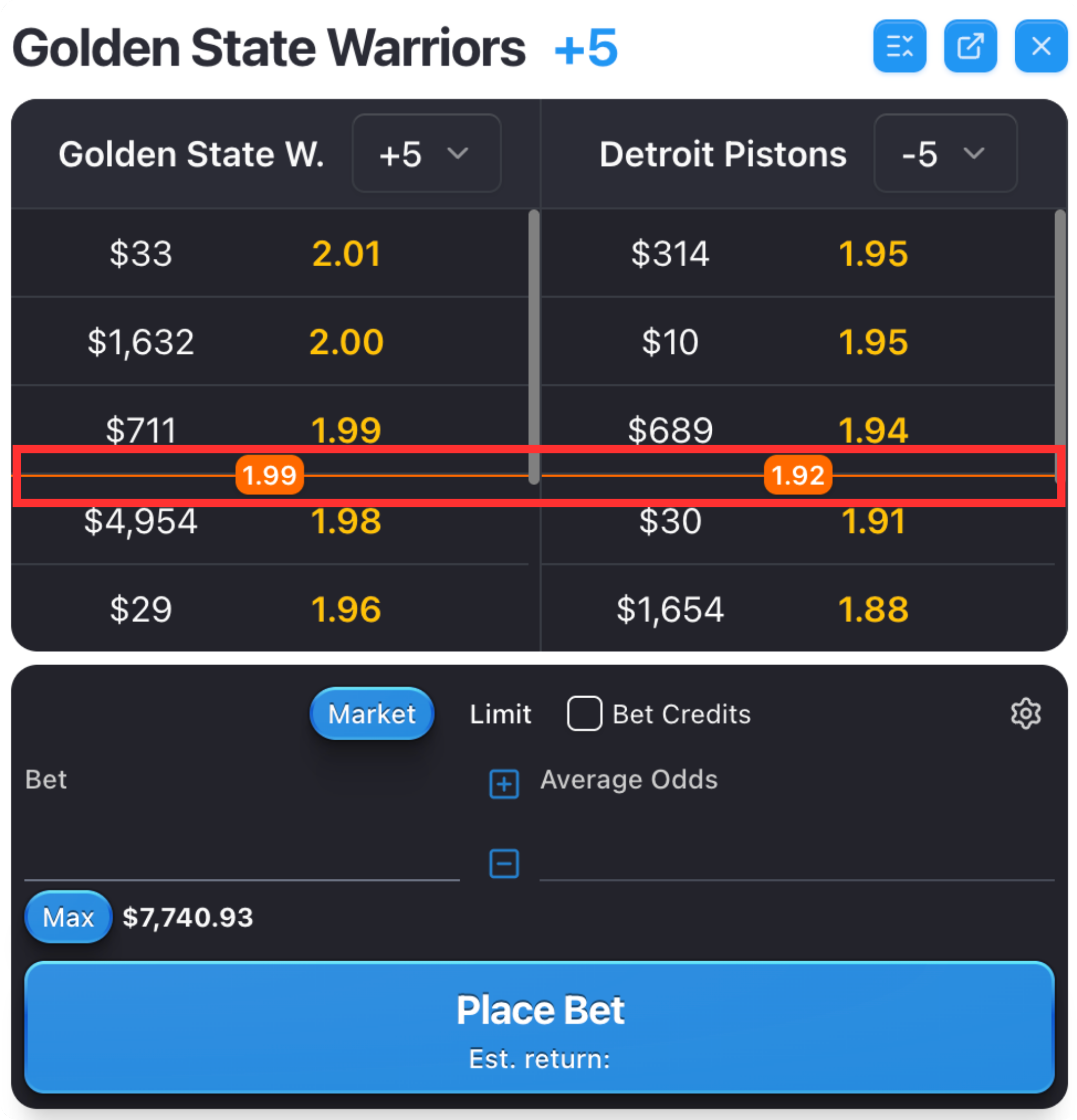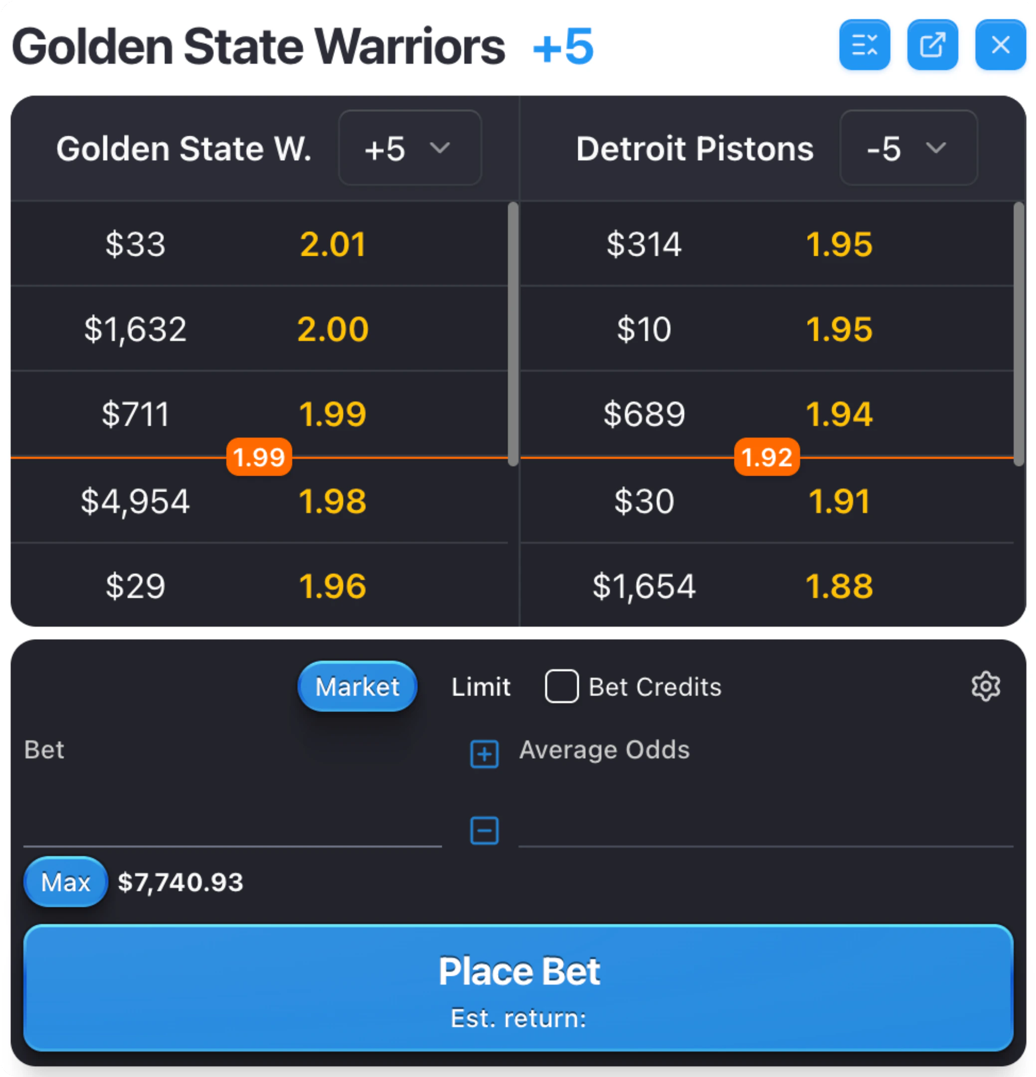Click any odds in the order book to open the bet slip pre-filled at that price. If you bet more than what’s available at a single price level, your order will fill across multiple levels or sit as an open limit order for the remainder.How to Place a Market Order